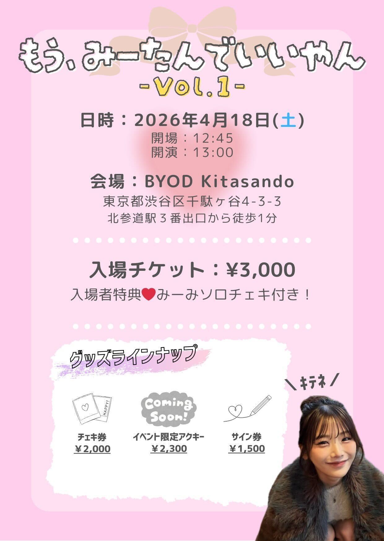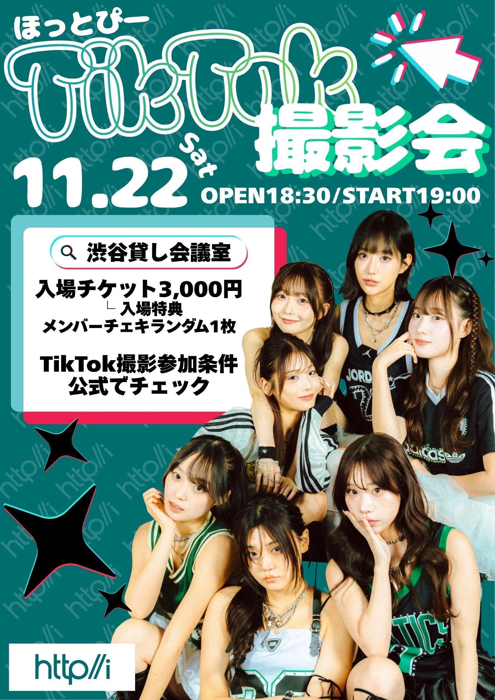 ほっとぴーのTikTok撮影会。入場チケット3,000円(推しチェキ付き)、チェキ券2,000円、サイン券1,500円。TikTok撮影券はグッズ20,000円分購入で配布。